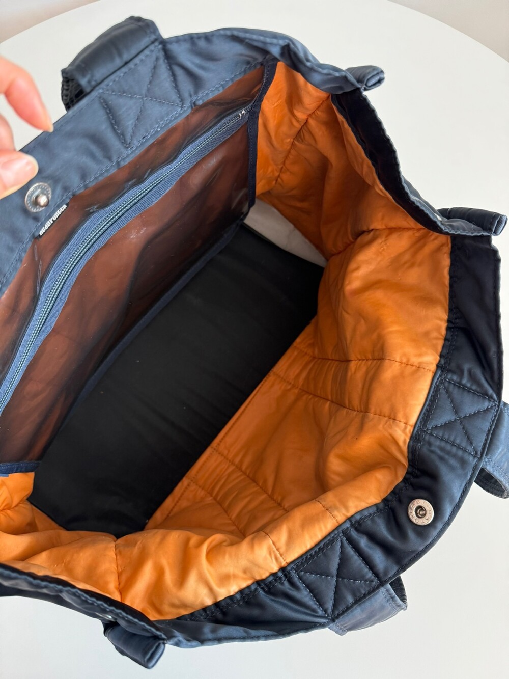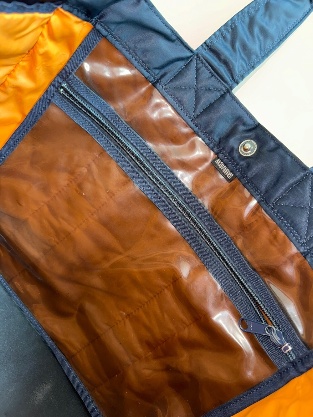 PORTER의 대명사 인 "TANKER"시리즈는 미국 공군의 비행 재킷 "MA-1 '을 모티브로 개발 한 오리지널 원단을 사용하고 있습니다. 나일론 (표면) + 폴리 에스테르면 (중간층) + 나일론 (뒷면)의 3 층 구조의 직물을 사용하여 가볍고 부드러운 감촉이 특징입니다. 안감은 본체와 대비되는 컬러 '오렌지'를 사용하여 보다 더 매력적입니다.